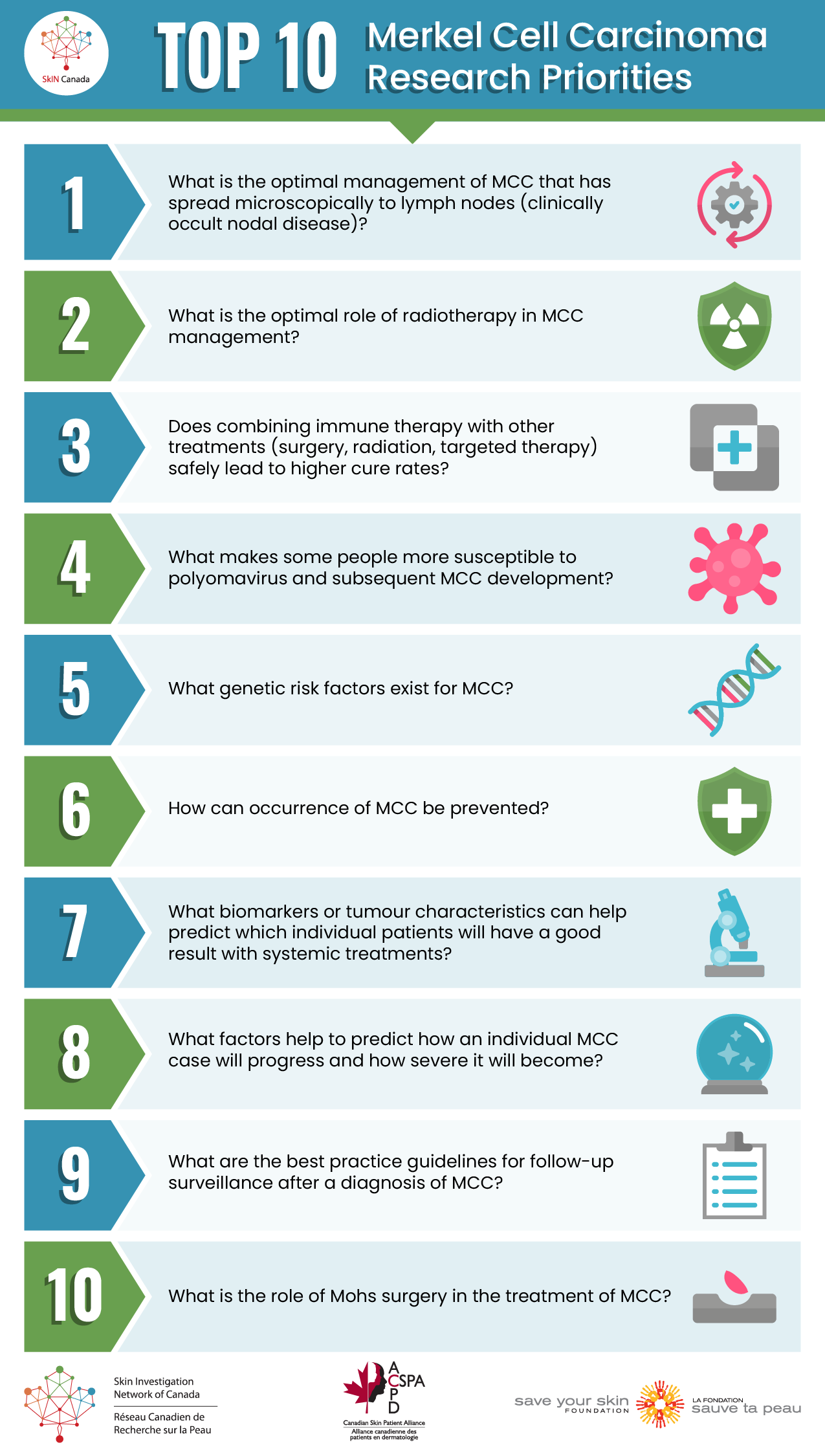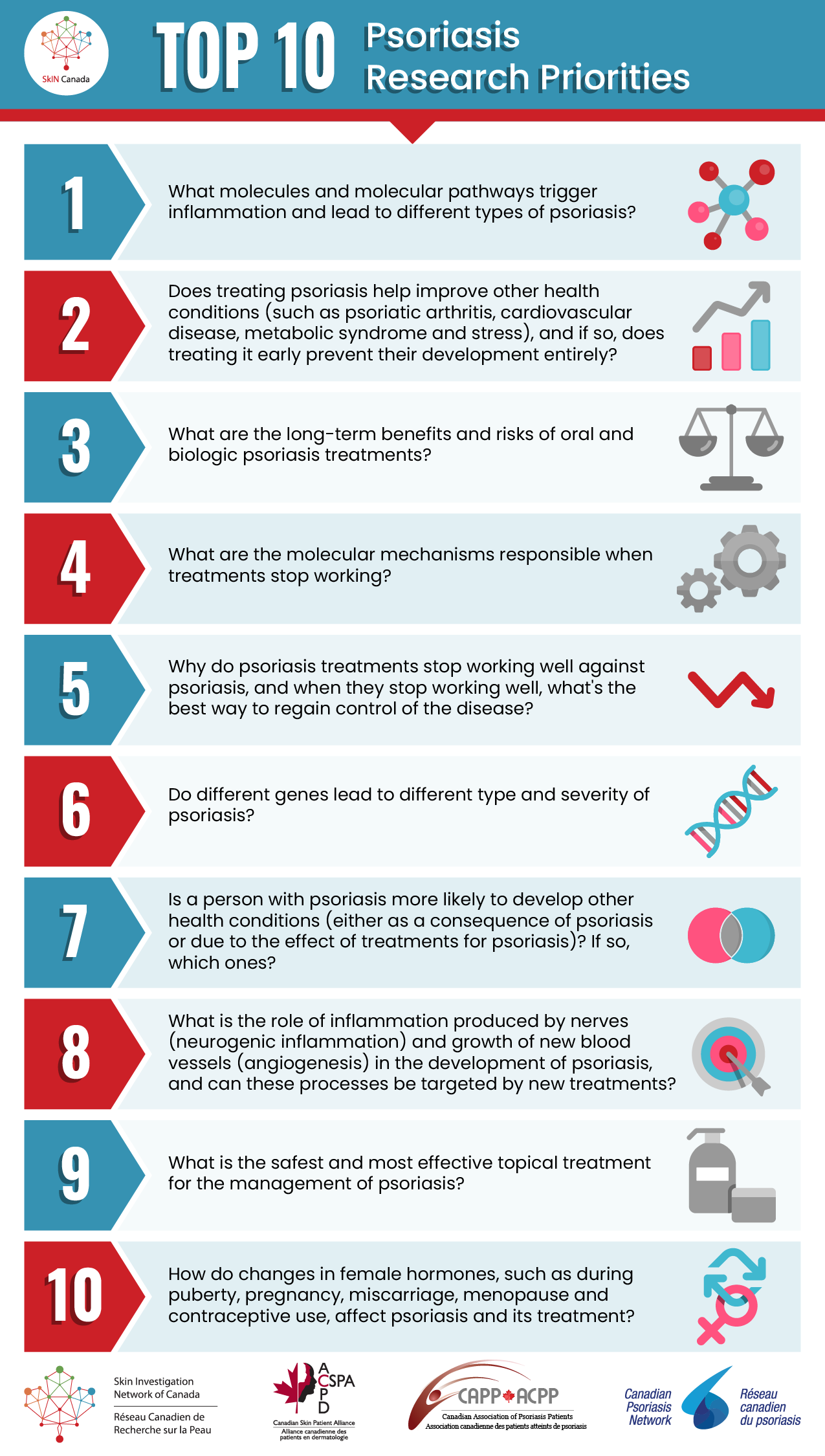 Each of the following Top Ten lists was developed using a systematic, multi-step process that included three survey rounds and a final workshop based on the James Lind Alliance methodology. Thank you to the 465 patients, clinicians, and researchers across Canada who shared their voice to help shape the skin research agenda.